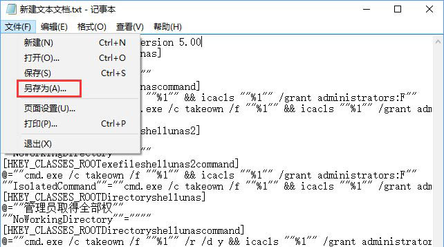 2、相应的注册表代码复制到记事本文件后,直接点击左上角的文件,然后在打开的下拉项中,选择另存为,另存为的文件名要修改成 .reg结尾的注册表文件即可;